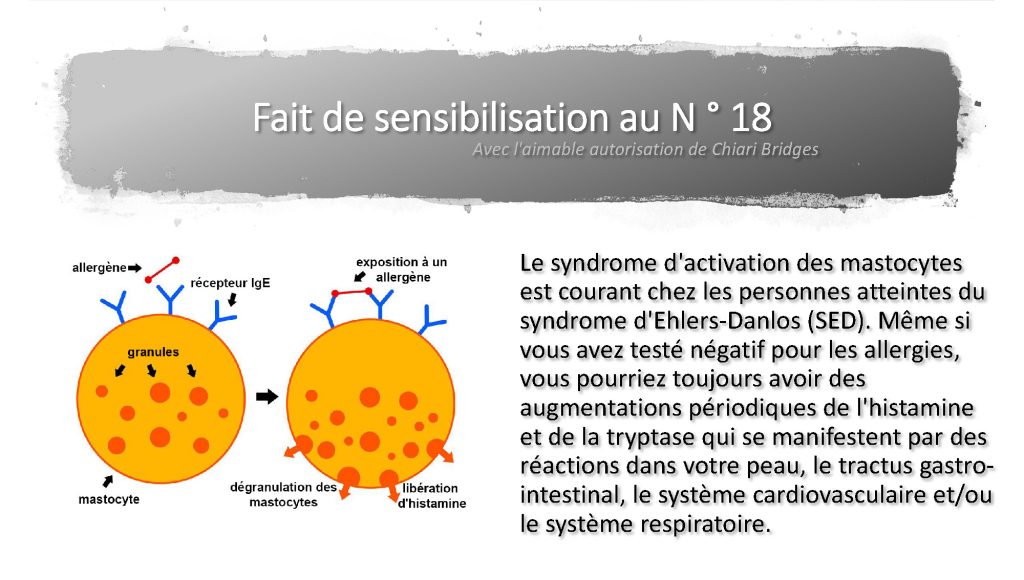 Pour en savoir plus sur le MCAS, secondaire à l’SED: https://onlinelibrary.wiley.com/doi/full/10.1002/ajmg.c.31555 Peau: rougeurs récurrentes, démangeaisons, gonflement, urticaire, dermatite (eczéma), augmentation/diminution de la transpiration Appareil digestif: douleur épisodique, urgence, syndrome du côlon irritable (SIB), RGO, œsophagite à éosinophiles (EoE), constipation, gastroparésie, augmentation des allergies/sensibilités alimentaires, problèmes de vésicule biliaire Cardiovasculaire, respiratoire et/ou neuropsychiatrique: Dysautonomie (orthostatique) Syndrome (STOP); tachycardie au repos; problèmes respiratoires) Anaphylaxie, rhinite (rhume des foins), anxiété, dépression.