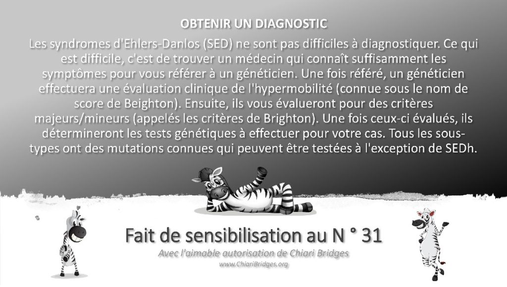 Pour plus d’informations sur EDS Diagnostics et la liste de contrôle des diagnostics SEDh la plus récente: hhttps://www.ehlers-danlos.com/eds-diagnostics/ et https://www.ehlers-danlos.com/heds-diagnostic-checklist/.